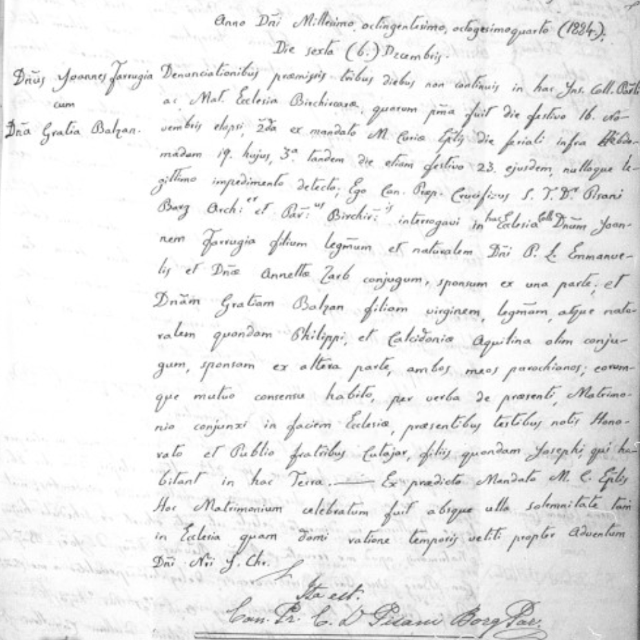 - Act of marriage of Giovanni Farrugia and Grazia Balzan. (1884). [online] (948). Available at: www.certifikati.gov.mt [Accessed 20 Aug. 2024][↩]